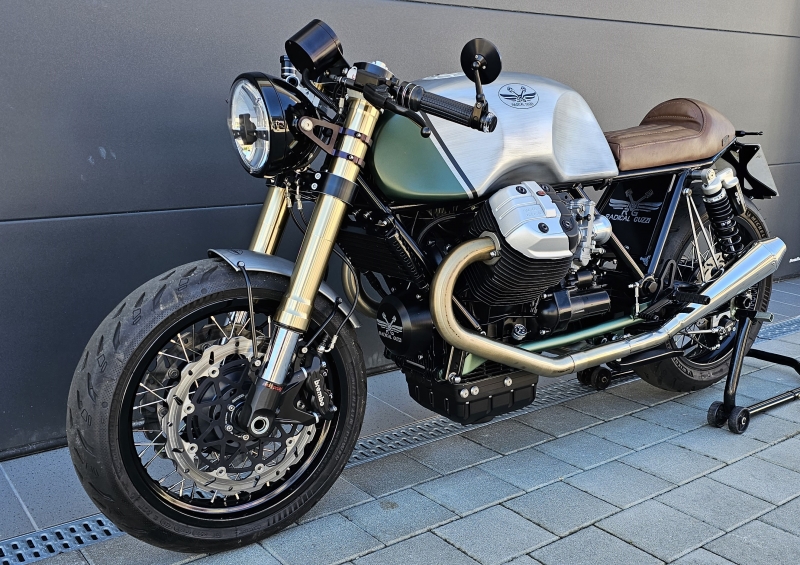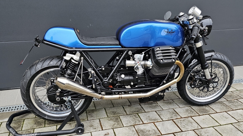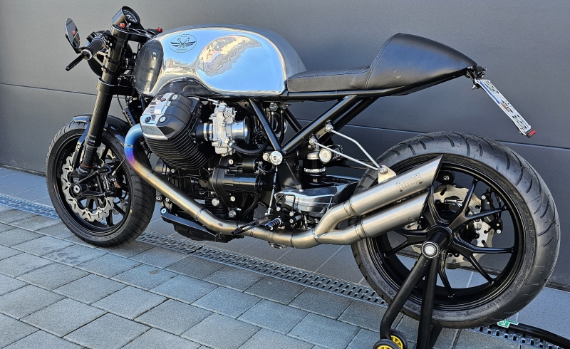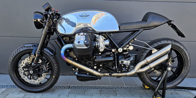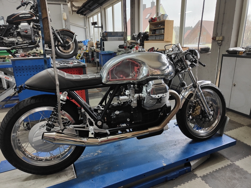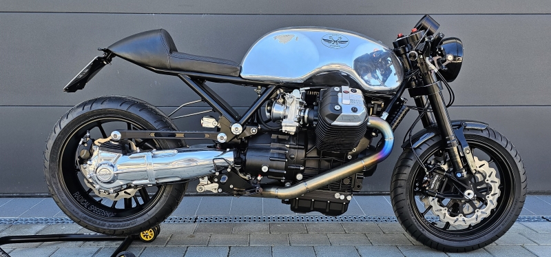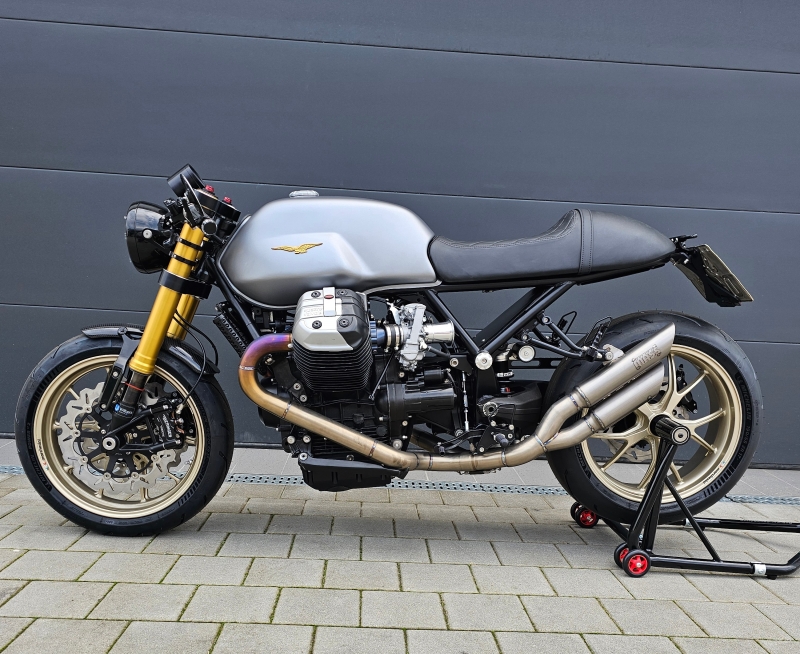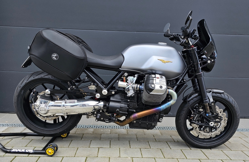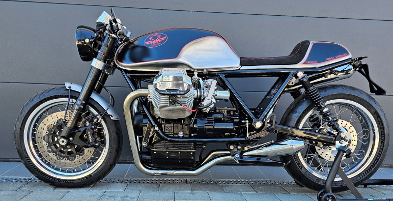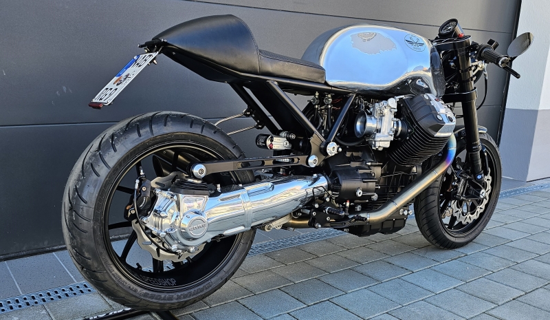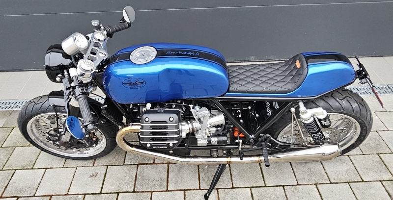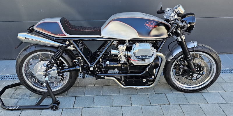 Diese Intercettore auf Basis eines Tonti Rahmen mit unserer Drehmomentgestützten Schwinge und USD Gabel ist ein absolutes Einzelstück und ist bestückt mit unserem 1313 ccm 2 Ventil Motor 120Ps und 125 Nm Titan Auspuffanlage ,5 Gang Getriebe,MGS 01 Schmiederäder