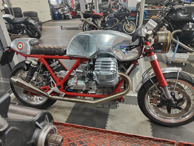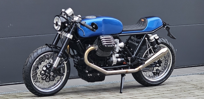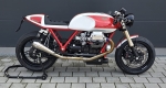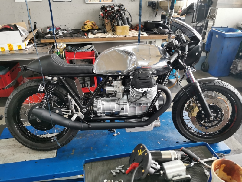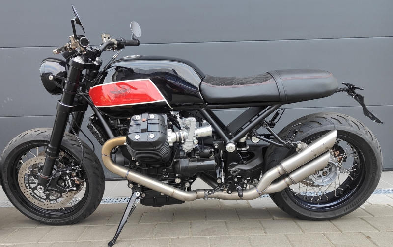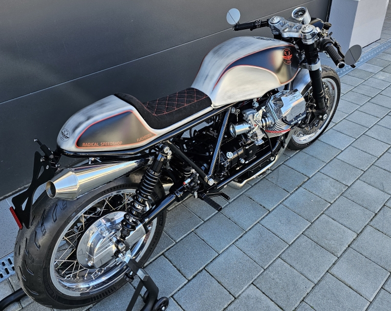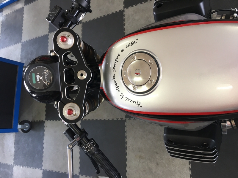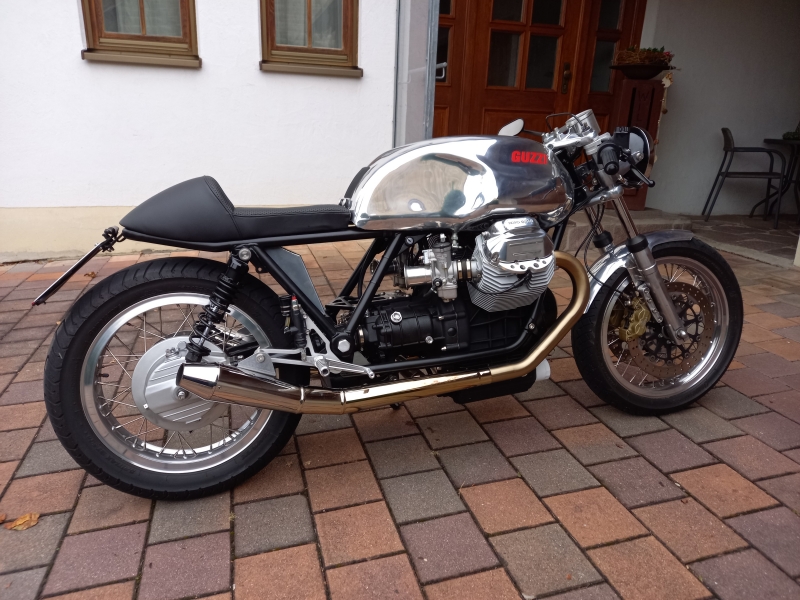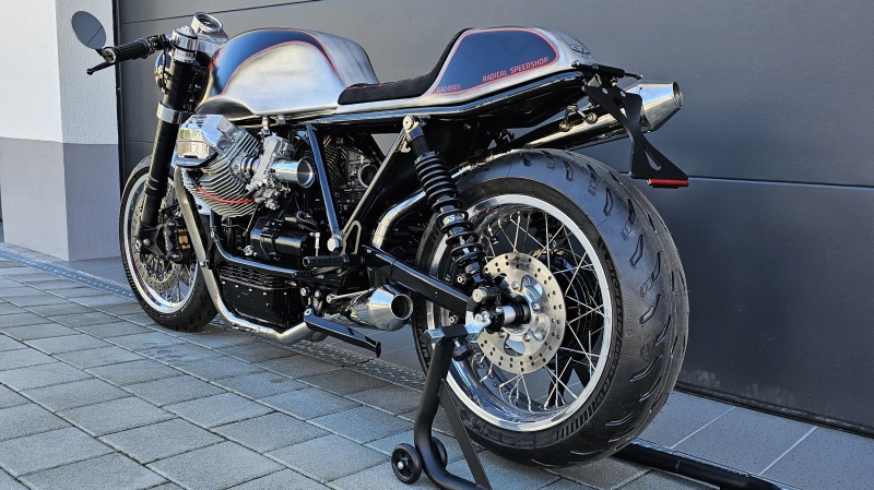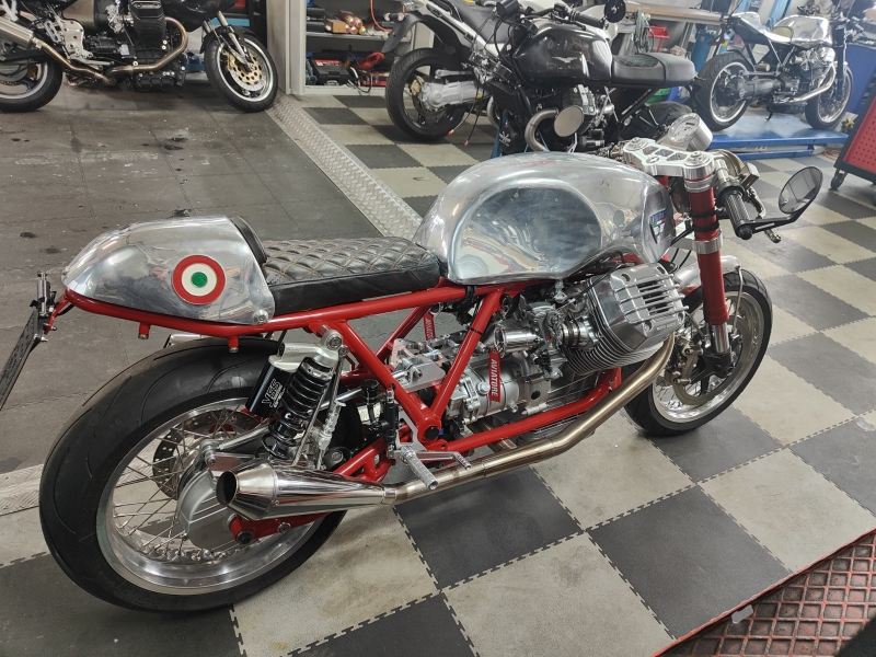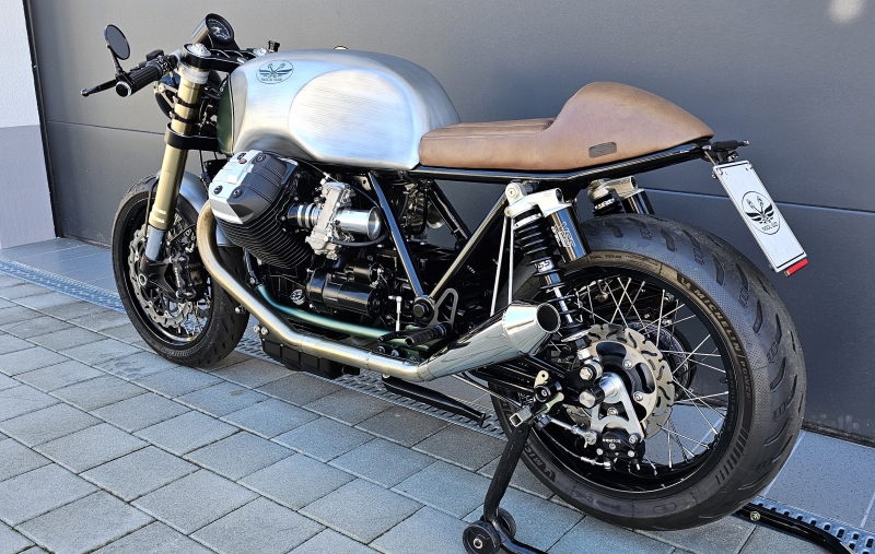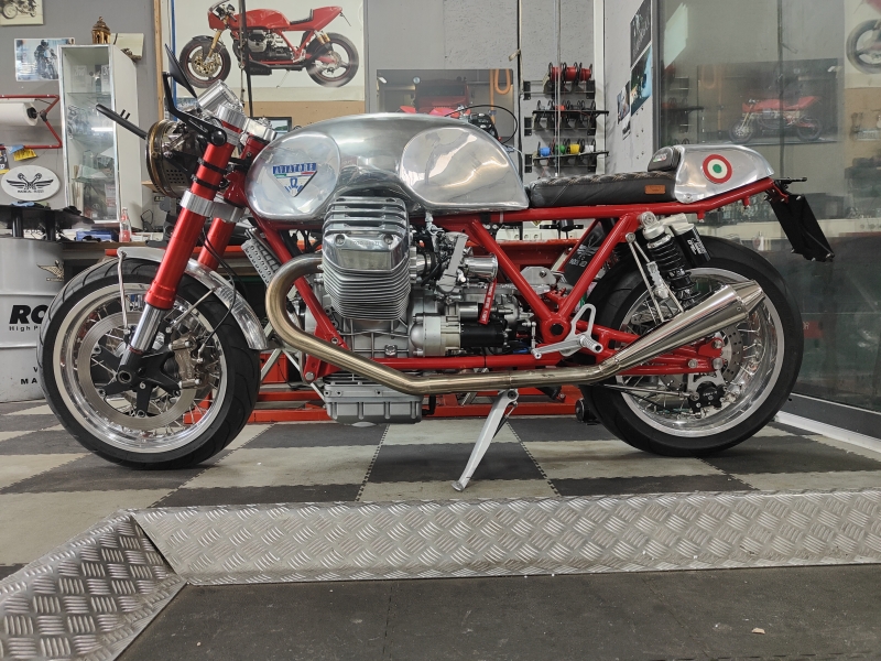 Diese Intercettore auf Basis eines Tonti Rahmen mit unserer Drehmomentgestützten Schwinge und USD Gabel ist ein absolutes Einzelstück und ist bestückt mit unserem 1313 ccm 2 Ventil Motor 120Ps und 125 Nm Titan Auspuffanlage ,5 Gang Getriebe,MGS 01 Schmiederäder